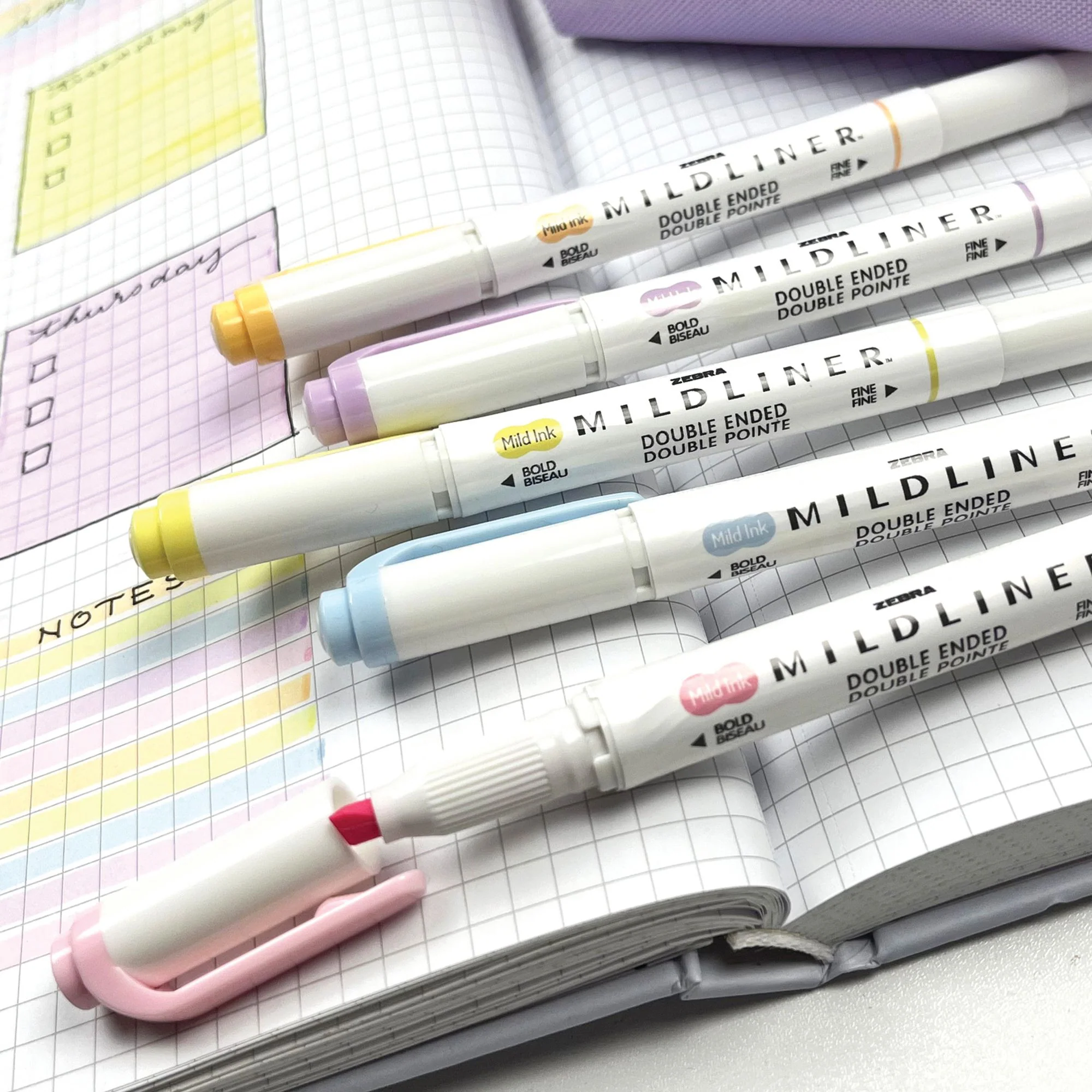 Zebra's Mildliner features a mild color ink that shows up softly on paper, and is double-ended with bullet and fine point tips for a wide variety of applications. Whether you are using the Mildliner for your rapid journal, planner, hand lettering or studying for your next exam, it will help you express yourself in a unique way. Ideal for hand lettering and creative applications. The mild water-resistant ink is translucent and excellent for layering and doesn't bleed through paper. AP Non-Toxic.